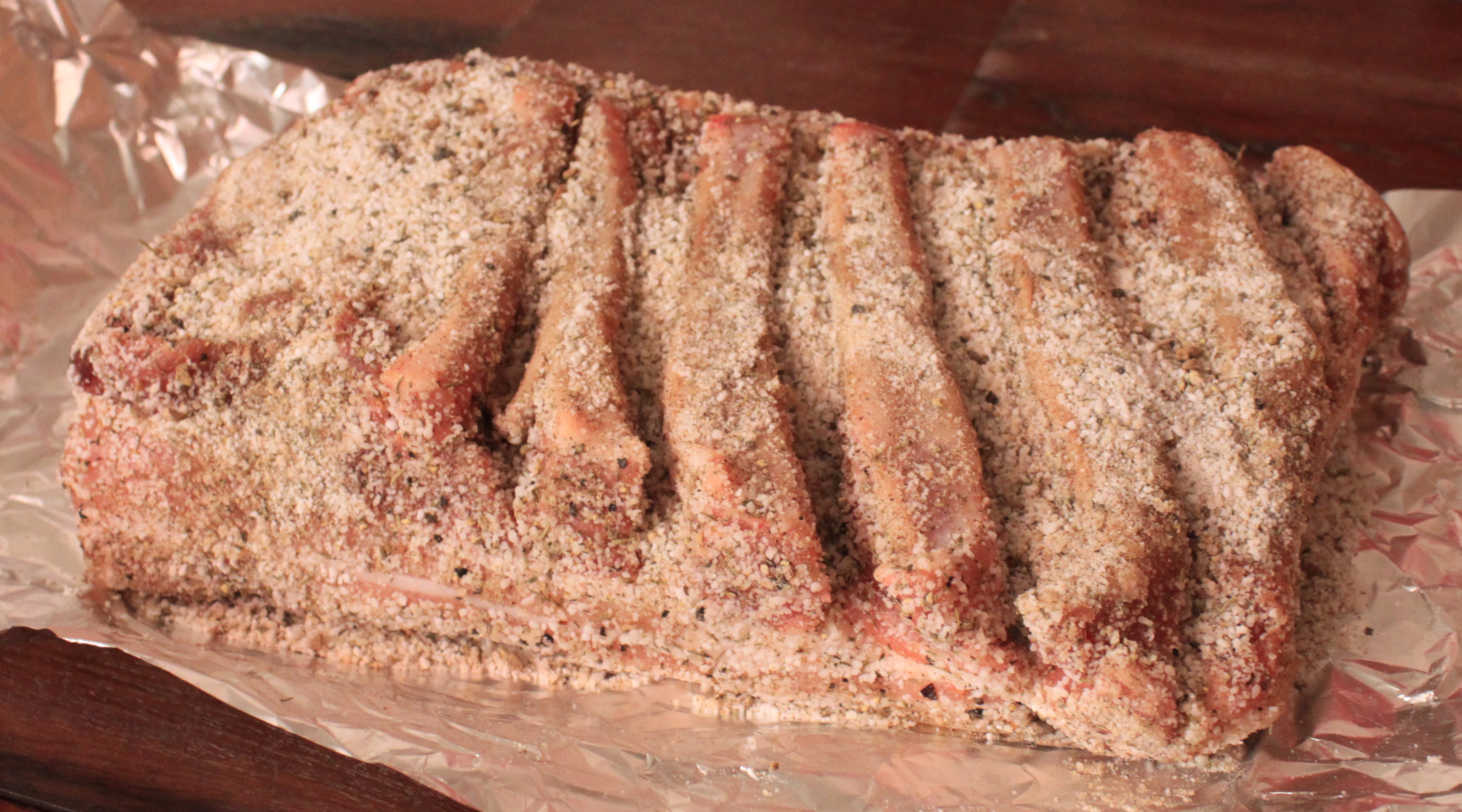 Remove the bone from the lamb shoulder (if you buy it at your local butcher, you can ask him to do it). Spread out some olive oil on the inside of the lamb shoulder and sprinkle it with 2 tbsp. of Italian seasoning and the chopped garlic.