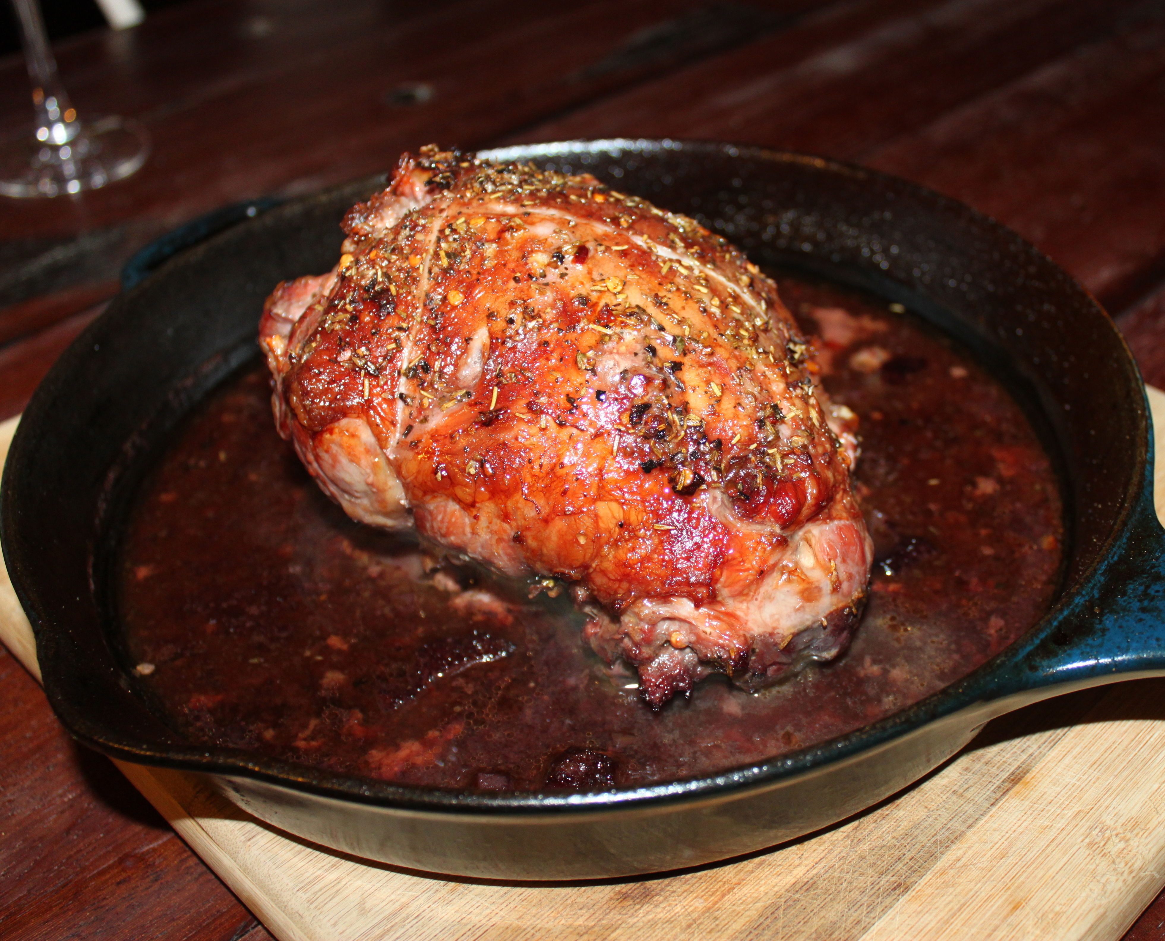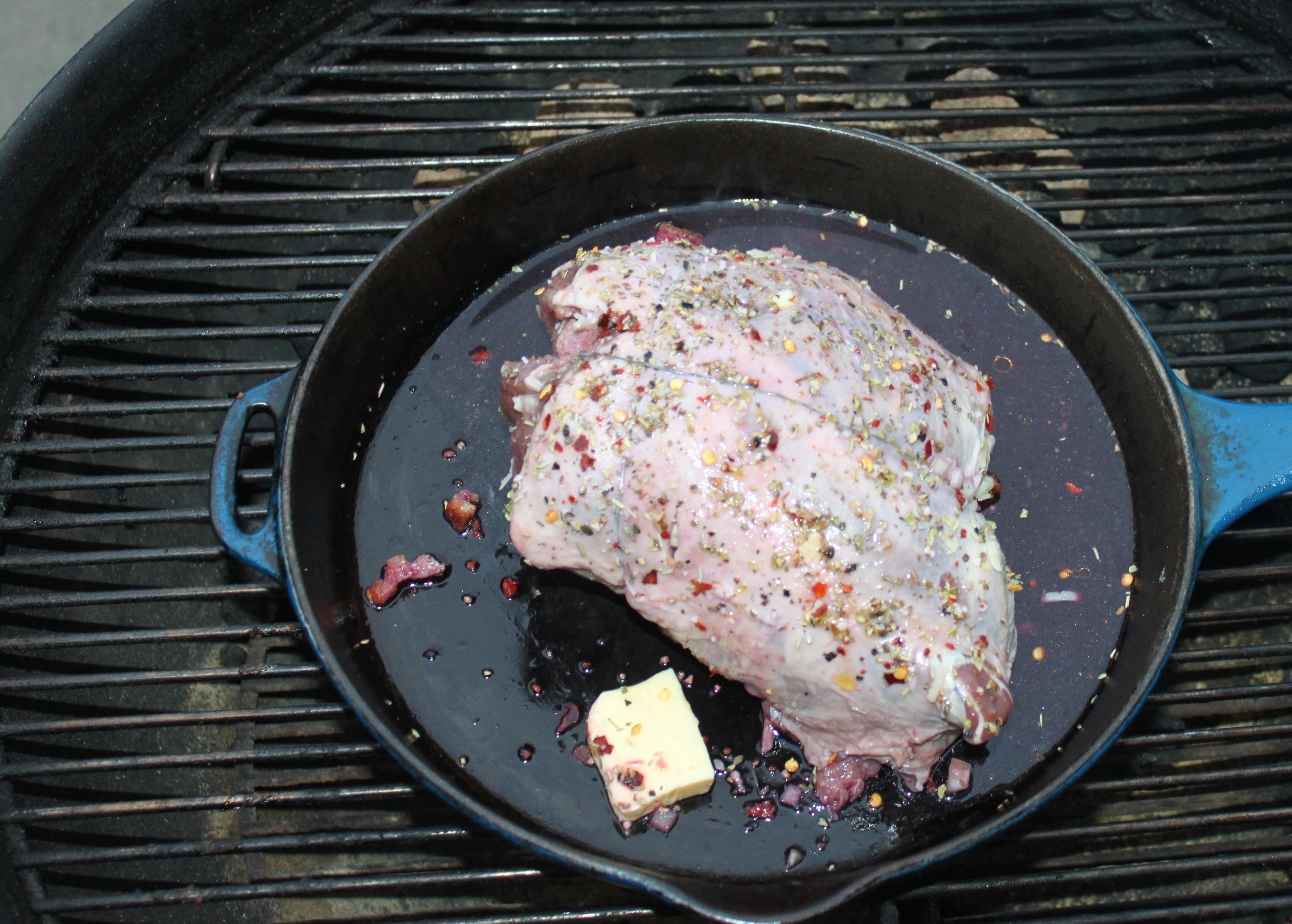 Set the cast iron pan with the meat in the middle of the grill and put on the lit. Turn the pan halfway through the cooking process, so it gets cook evenly on both sides. Remove from the grill when it has reached the target temperature and let rest for 10-15 minutes.