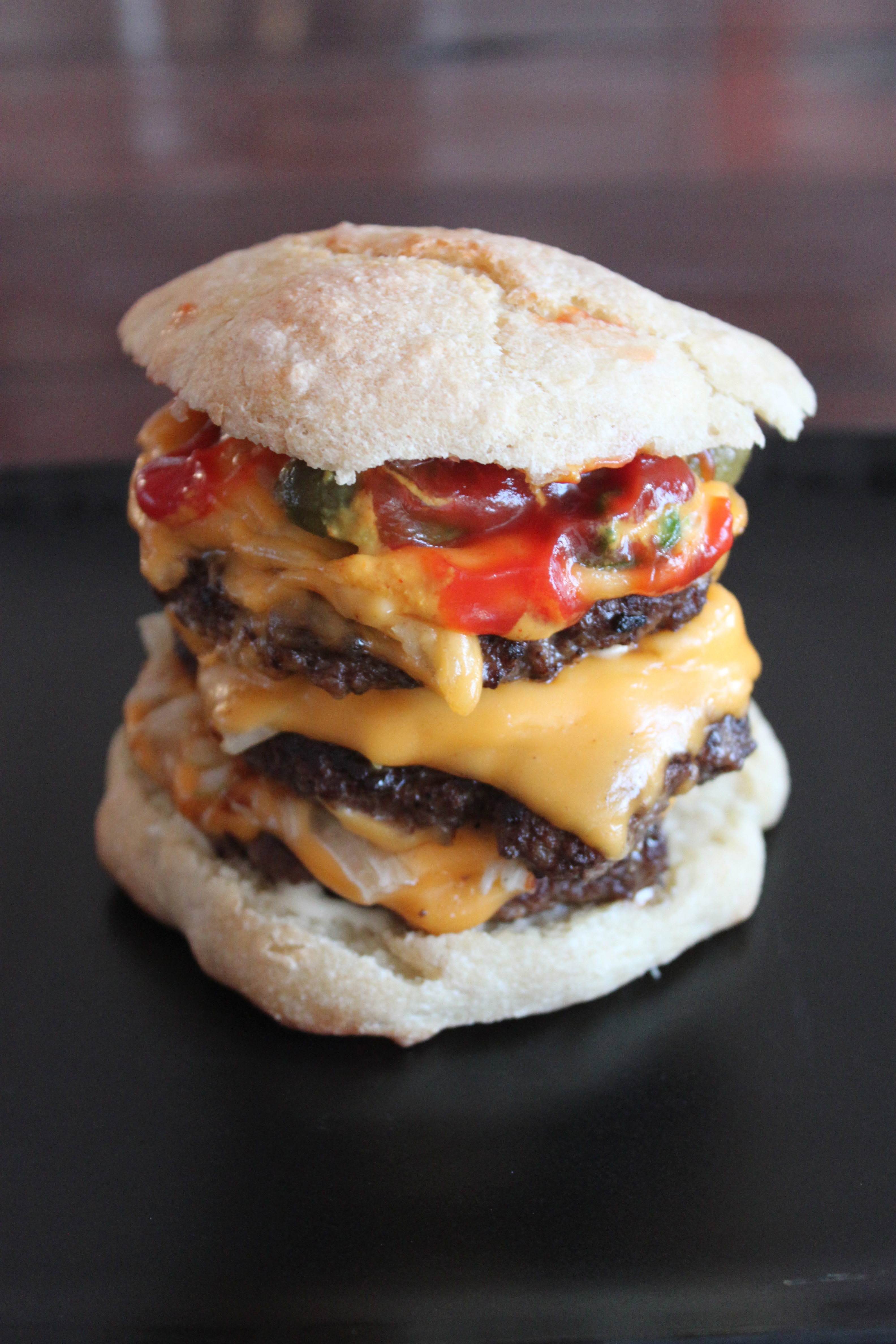 When all patties are grilled and the buns are warm, you are ready to assemble your triple cheese burger 🙂
