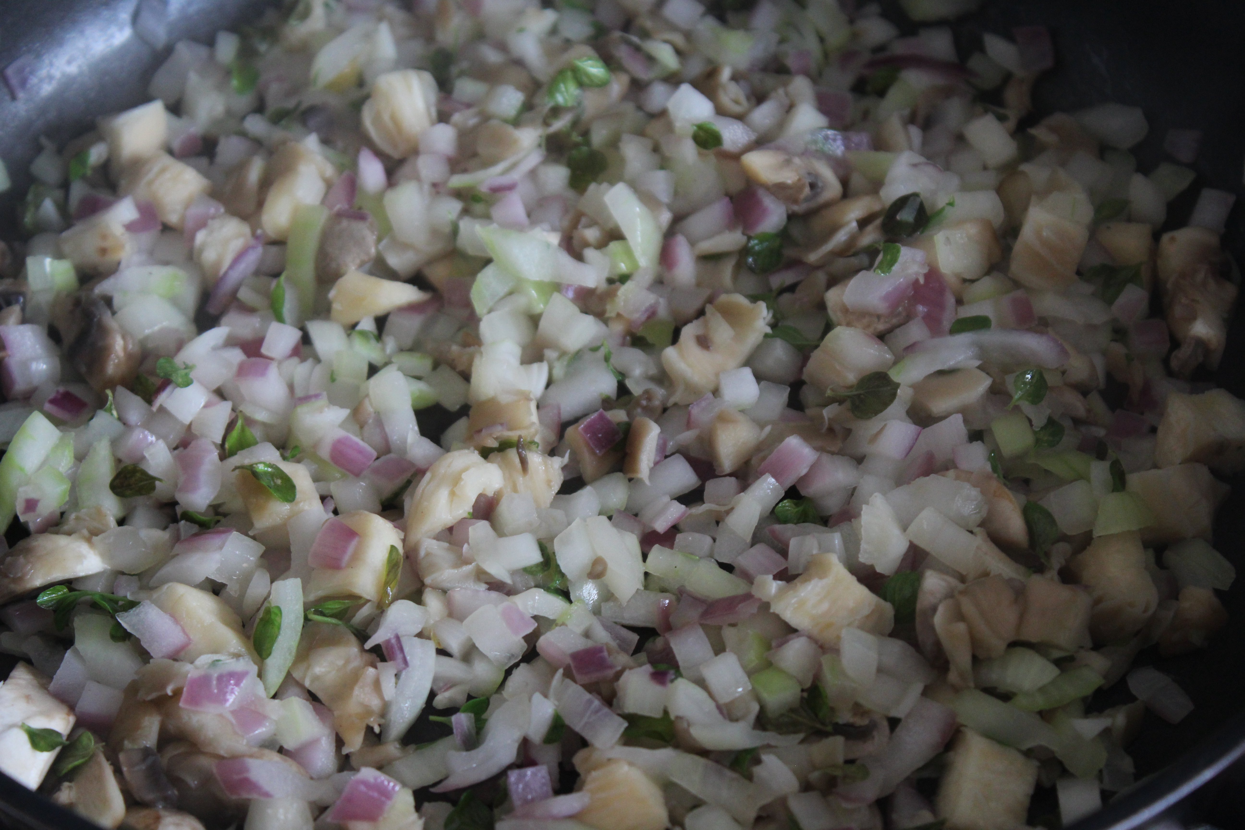 Melt the butter on a medium-hot pan and sauté onions, mushrooms, garlic and thyme for 4-5 minutes or until the onion pieces begin to soften a bit. Set aside while preparing the meat and bacon.