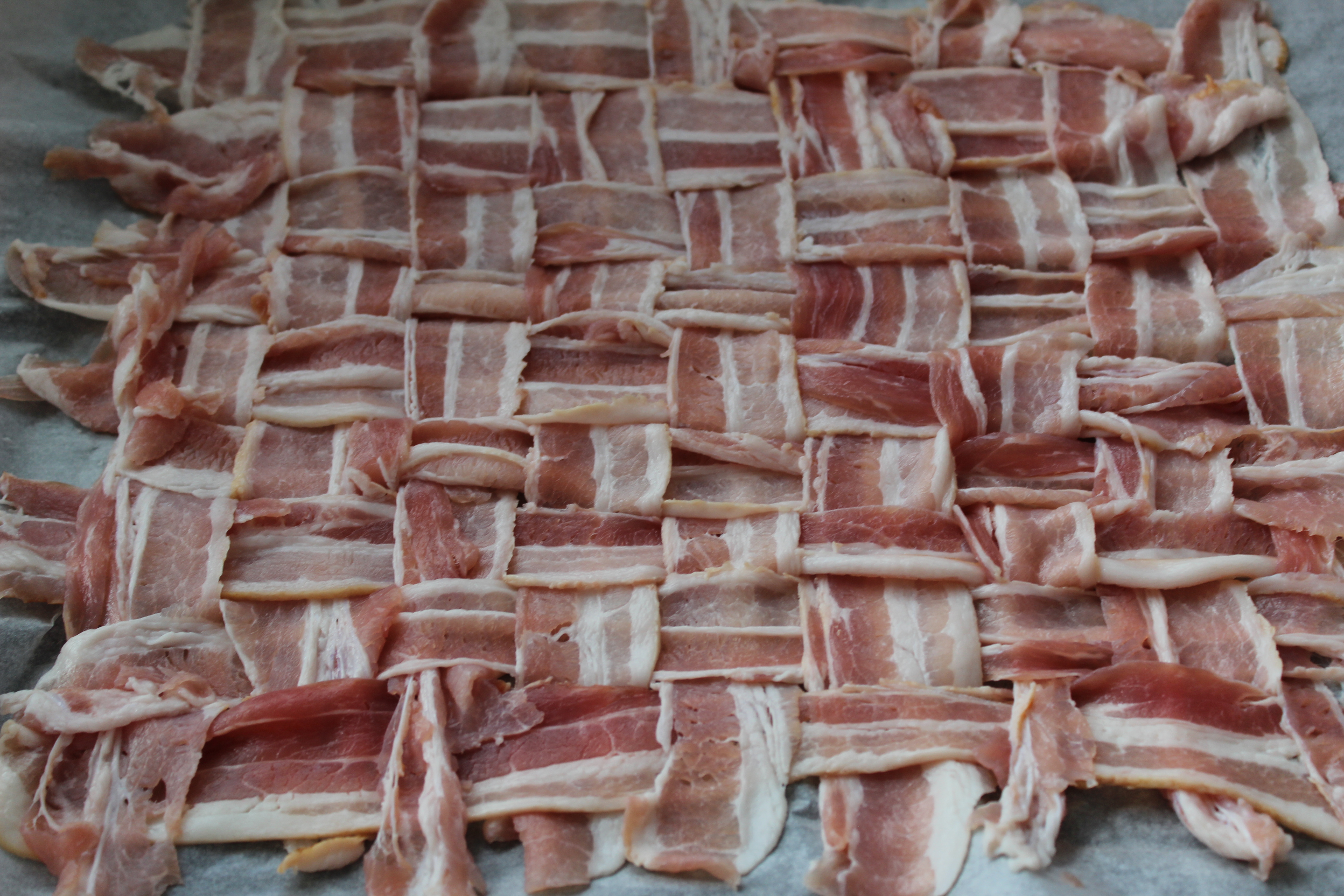 Weave the bacon slices together, as shown on the picture below. Do it on a piece of baking paper, so it is easy to wrap around the meat when finished. Set aside.