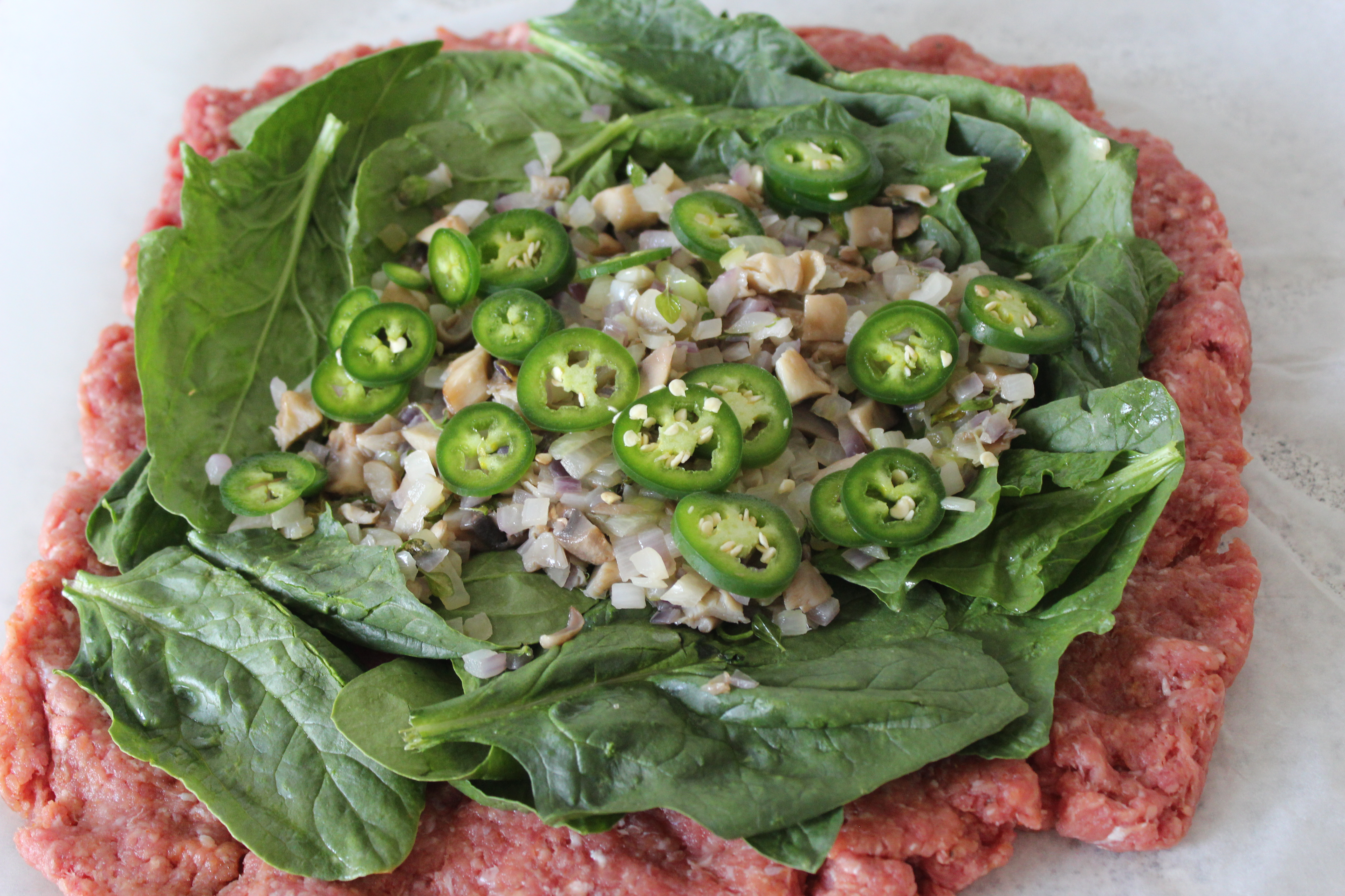 Spread the shredded cheddar on to the meat followed by the rinsed spinach (remember to rinse the spinach thoroughly, as it is one of those vegetables that might contain a lot of dirt), the onion and mushroom mix and last (but not least) the jalapeños slices. Be aware to leave an edge in the meat, so that the vegetables and cheese and be fully covered when making the meat roll.