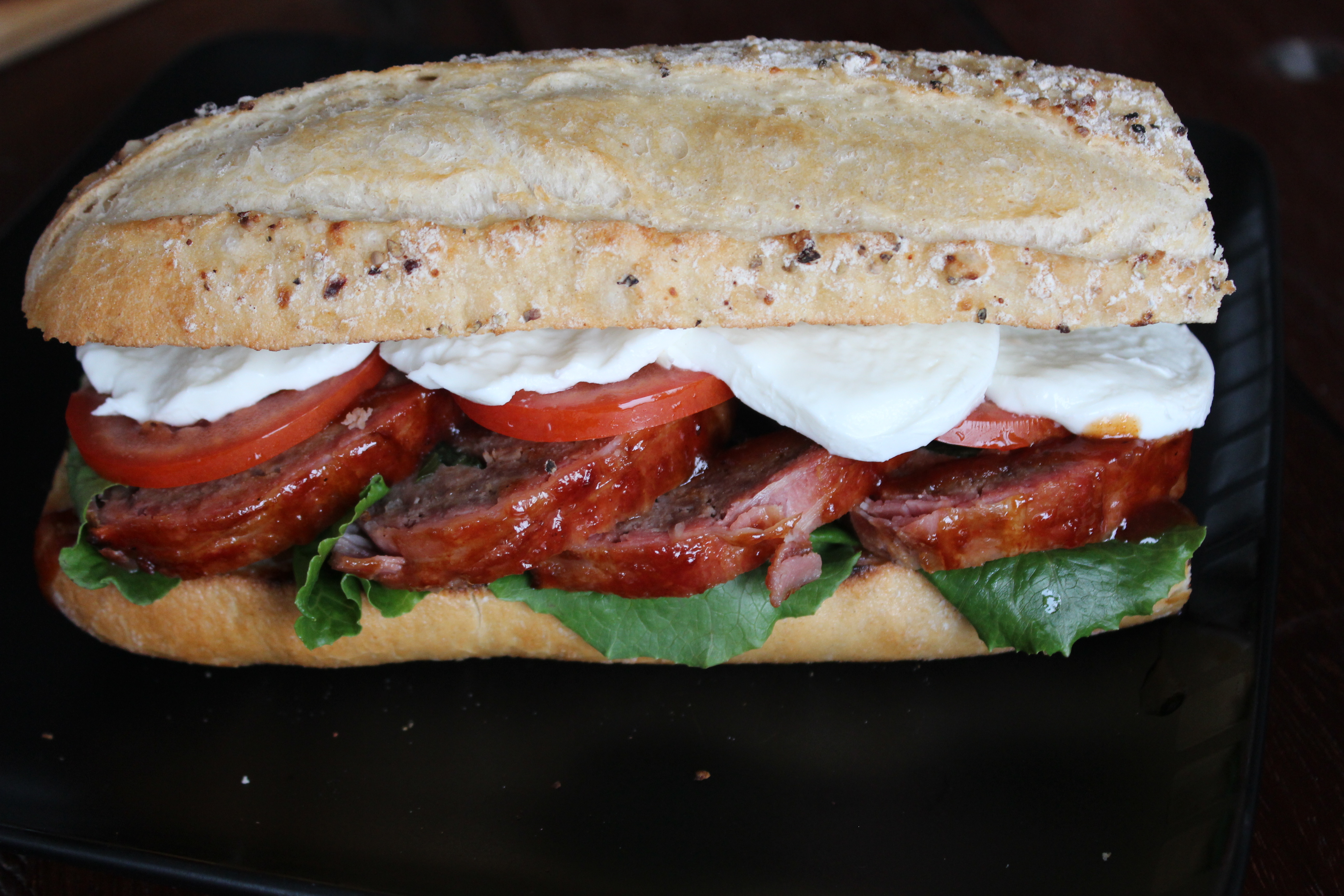 Spread out a few stripes of BBQ sauce on the meat slices before placing the tomato and mozzarella on top and finally the top half of the baguette.