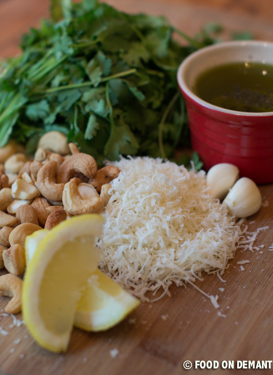 I buy cilantro every time I get to Farmer’s Market or the local super market and sometimes I get a little to excited and buy too much, which is what happened the other day when I bought 3 bundles when I only needed 1. When I opened the fridge this morning I realized that the last of the 3 bundles looked a little tired and needed to be used immediately or it would go to waste, and as a new thing in my new American life I have decided that nothing should go to waste unless it is dangerous to consume. So I thought “why not make a cilantro pesto?” and so I did…