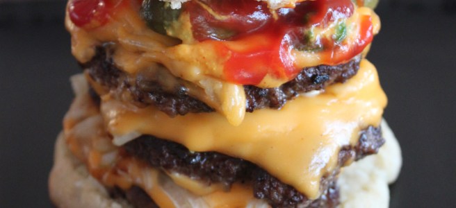 When all patties are grilled and the buns are warm, you are ready to assemble your triple cheese burger 🙂